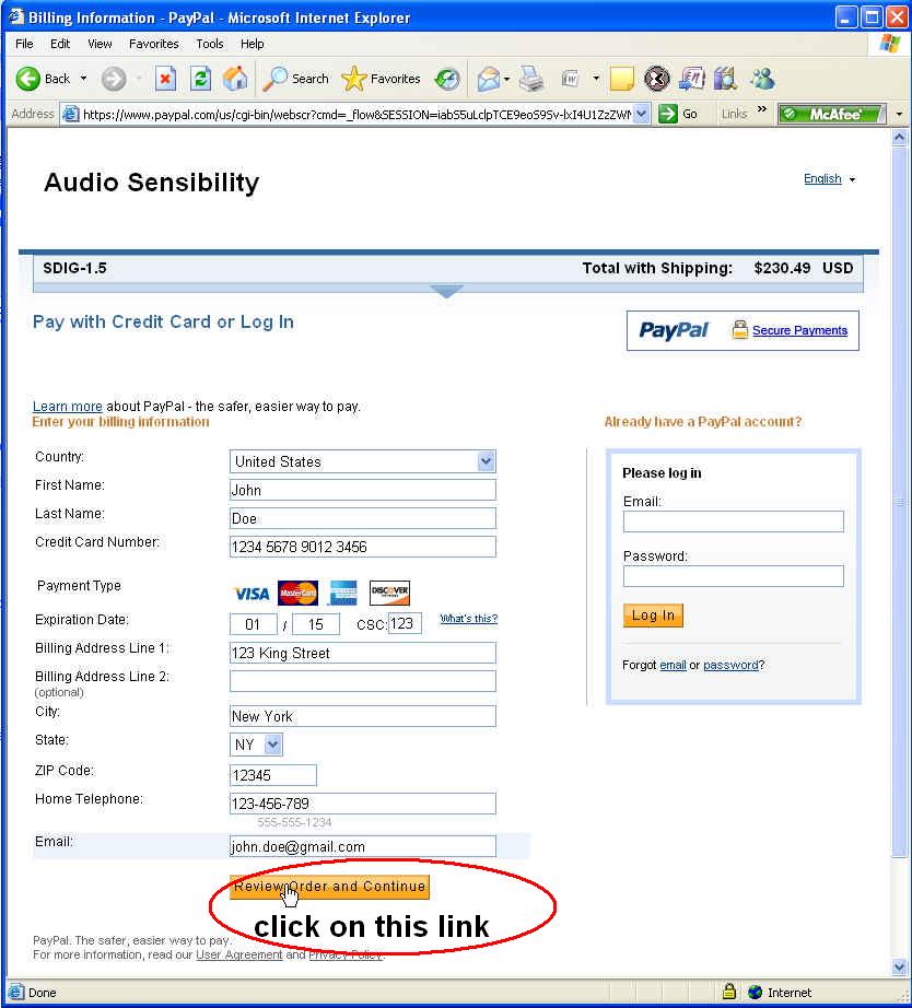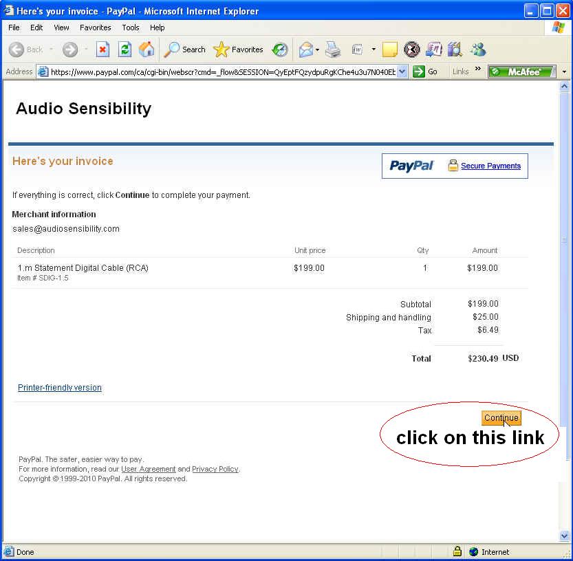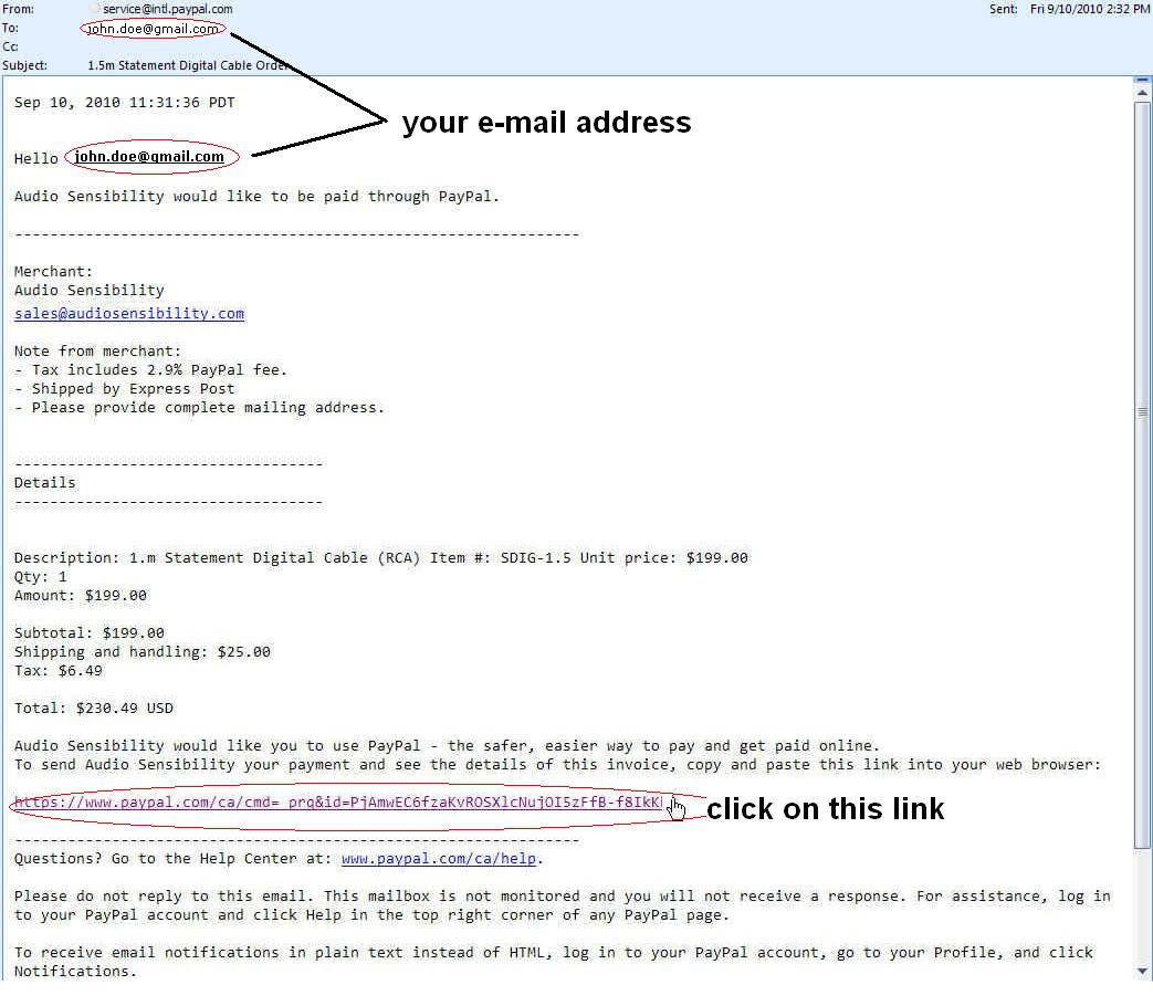 Click on the PayPal link in the e-mail which will direct you to the secure PayPal Merchant Services web site.