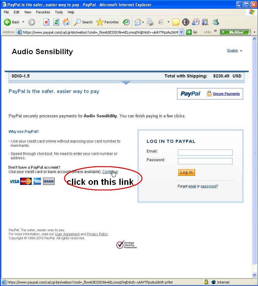 | Note: | If the Don't have a PayPal account? section of the web page does not appear, then the e-mail address that you are using has been associated with a PayPal account therefore removing this payment option. You will still get the traditional LOG IN TO PAYPAL. You have two choices: